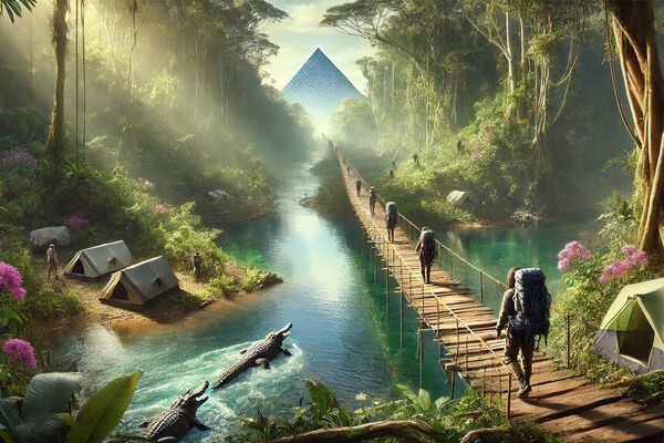 Das Dickicht steht dafür, dass das Team sich auf eine Reise begibt, durch den Dschungel. Der Dschungel kann beispielsweise unsere wirtschaftliche Lage sein. Also hatte das Team kleine Gruppen gebildet, die jetzt gemeinsam den Dschungel erkunden und dazu Freunde suchen. Die Freunde sind die Geschäftspartner der peoplefone, welche das Team auf der kleinen Expedition begleiten. Wie das so bei einem Weg durch den Dschungel ist - hinter jeder Wegbiegung kann Gefahr lauern, ein Hindernis, ein Feind. Das findet man auch in der Wirtschaft. Auf dem Bild vertreten sind die Gefahren durch die Reptilien im Wasser. Das Team begibt sich auf den Weg zu der Pyramide, die man am Horizont sieht.