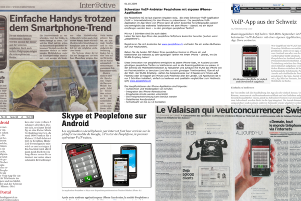 peoplefone is the first provider in Switzerland to launch a VoIP app for iPhone OS, attracting broad media attention. Private customers can avoid high roaming costs when they are abroad. In 2010 the app is also available for Android OS.