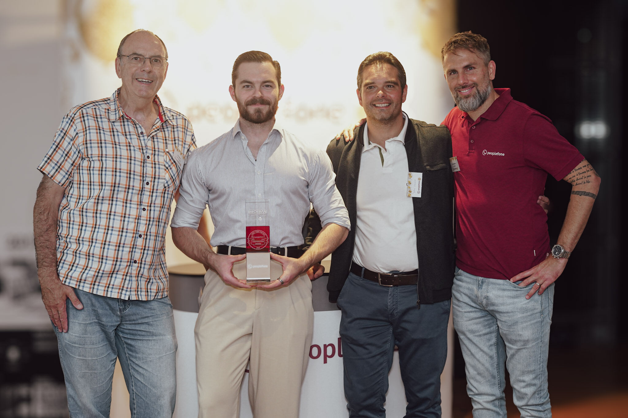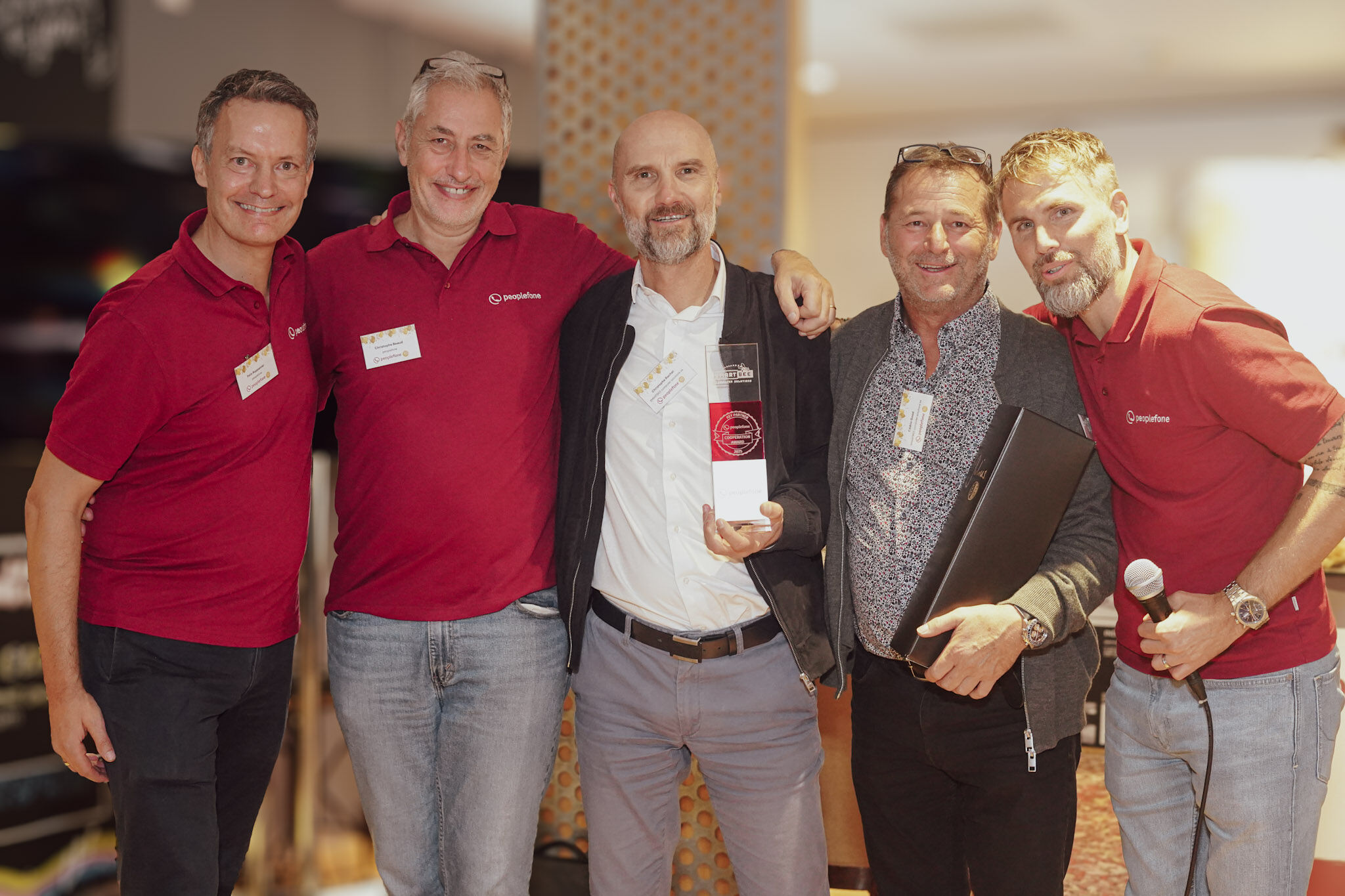 Ce prix est décerné chaque année au partenaire clé qui a réalisé la coopération la plus fructueuse avec peoplefone au cours de l'année écoulée. Nous félicitons chaleureusement Cédric Good et Christophe Rachel et remercions toute l'équipe SmartBee pour son partenariat étroit et basé sur la confiance.
